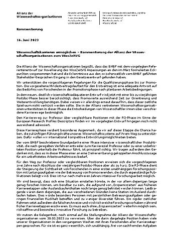 Die Allianz der Wissenschaftsorganisationen begrüßt, dass das BMBF mit dem vorgelegten Referentenentwurf zur Novellierung des WissZeitVG Anpassungen an den im März formulierten Eckpunkten vorgenommen hat und die Erkenntnisse aus den zwischenzeitlich vom BMBF geführten Stakeholder-Gesprächen Eingang