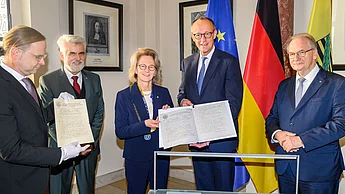 Nachricht 18.11.2025Im Rahmen seines Antrittsbesuchs in Sachsen-Anhalt hat Bundeskanzler Friedrich Merz heute Vormittag die Nationale Akademie der Wissenschaften Leopoldina an ihrem Hauptsitz in Halle (Saale) besucht. Begrüßt wurde er von dem Ministerpräsidenten des Landes, Reiner Haseloff, und von Leopoldina-Präsidentin Bettina Rockenbach.