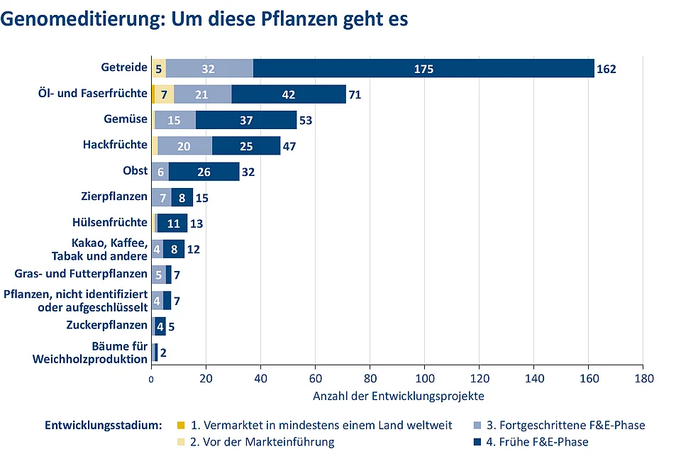 Die Genomeditierungsverfahren sind effizient und kostensparend. Das fördert zum einen den Wettbewerb, zum anderen ein breites Spektrum von Ideen und methodischen Ansätzen. Der JRC-Report der EU-Kommission verzeichnet in seiner Datenbank mehr als 66 Pflanzenarten, die mit neuen genomischen Verfahren neue Eigenschaften verliehen bekommen sollen – von Aubergine bis Zuckerrohr. Darunter sind auch sogenannte Orphan Crops, also vernachlässigte Nutzpflanzen, wie Maniok, Hirse und Kichererbsen, die in der Pflanzenzüchtung bisher eher eine untergeordnete Rolle spielen.
