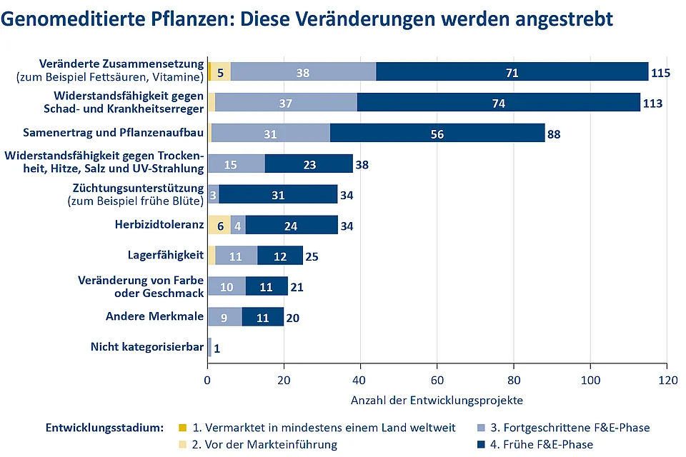 Abbildung 2: Zahl der Projekte in Forschung- und Entwicklung (F&E) weltweit, bei denen Pflanzen per Genomeditierung modifizierte oder neue Merkmale erhalten sollen, aufgeschlüsselt nach Merkmalskategorien. Die Übersicht über die insgesamt 426 Projekte wurde für einen Bericht des Joint Research Centre der Europäischen Kommission erstellt. Quelle: Parisi, C., Rodrigeuz-Cerezo, E., Current and future market applications of new genomic techniques, Luxemburg, 2021