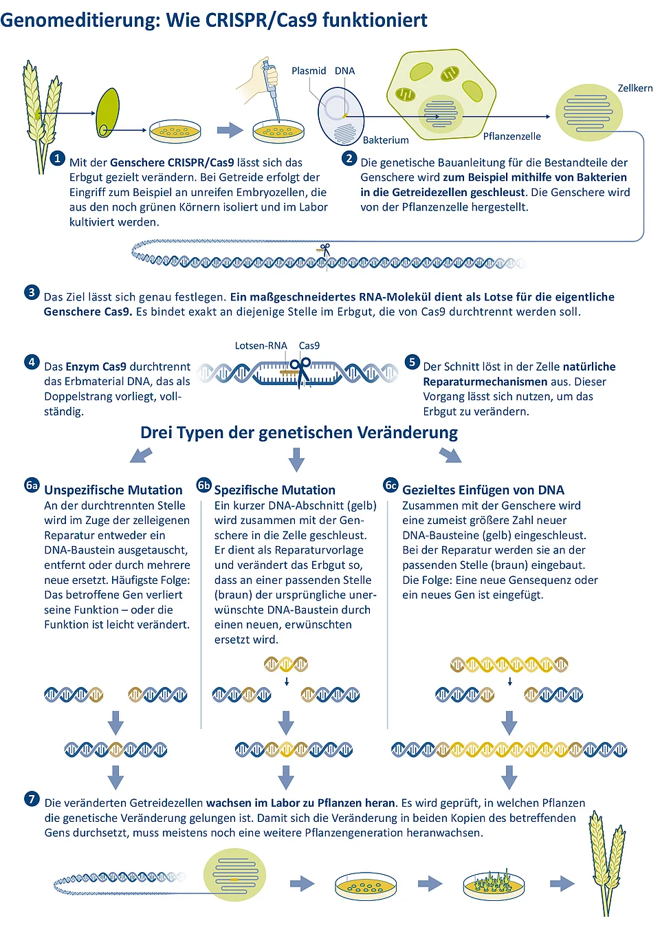 Im Bemühen um gute landwirtschaftliche Erträge war die Menschheit schon immer erfinderisch. Bereits durch Selektion nützlicher natürlich auftretender Genveränderungen hat sie das Erbgut von Getreide und anderen Nutzpflanzen beeinflusst. Gentechnik ermöglicht es, Erbmerkmale gezielt zu übertragen. Die Genomeditierung präzisiert und vereinfacht derartige Anwendungen.