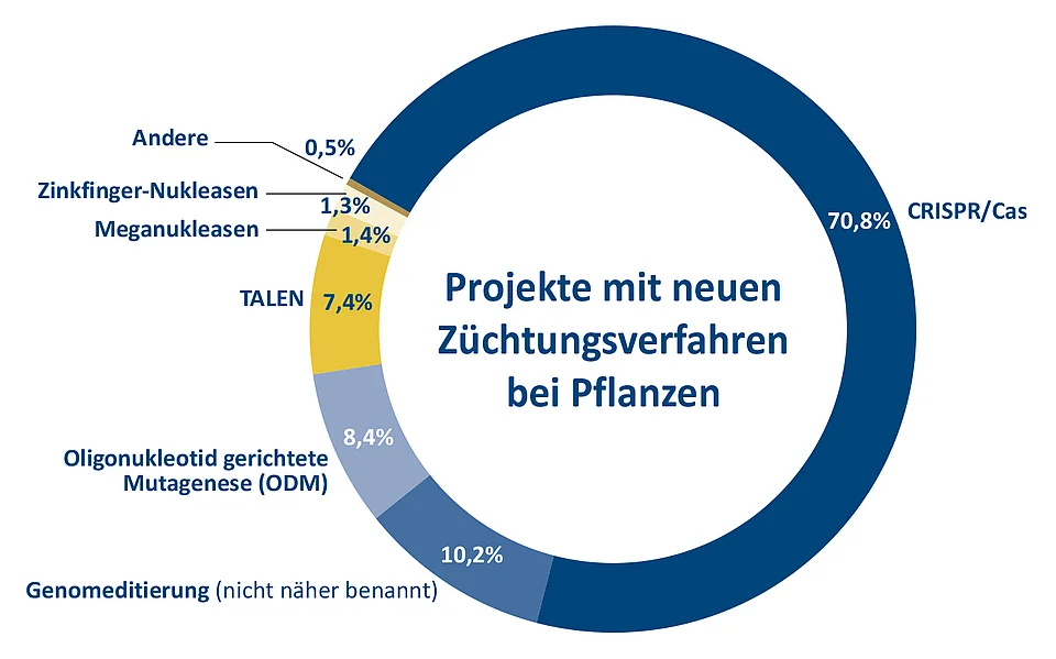 Abbildung 4: Anteil der verschiedenen Genomeditierungsverfahren bei Projekten zur Entwicklung von Pflanzen mit modifizierten oder neuen Merkmalen. Die Übersicht über die insgesamt 426 Projekte weltweit wurde für einen Bericht des Joint Research Centre der Europäischen Kommission erstellt. Quelle: Parisi, C., Rodrigeuz-Cerezo, E., Current and future market applications of new genomic techniques, Luxemburg, 2021